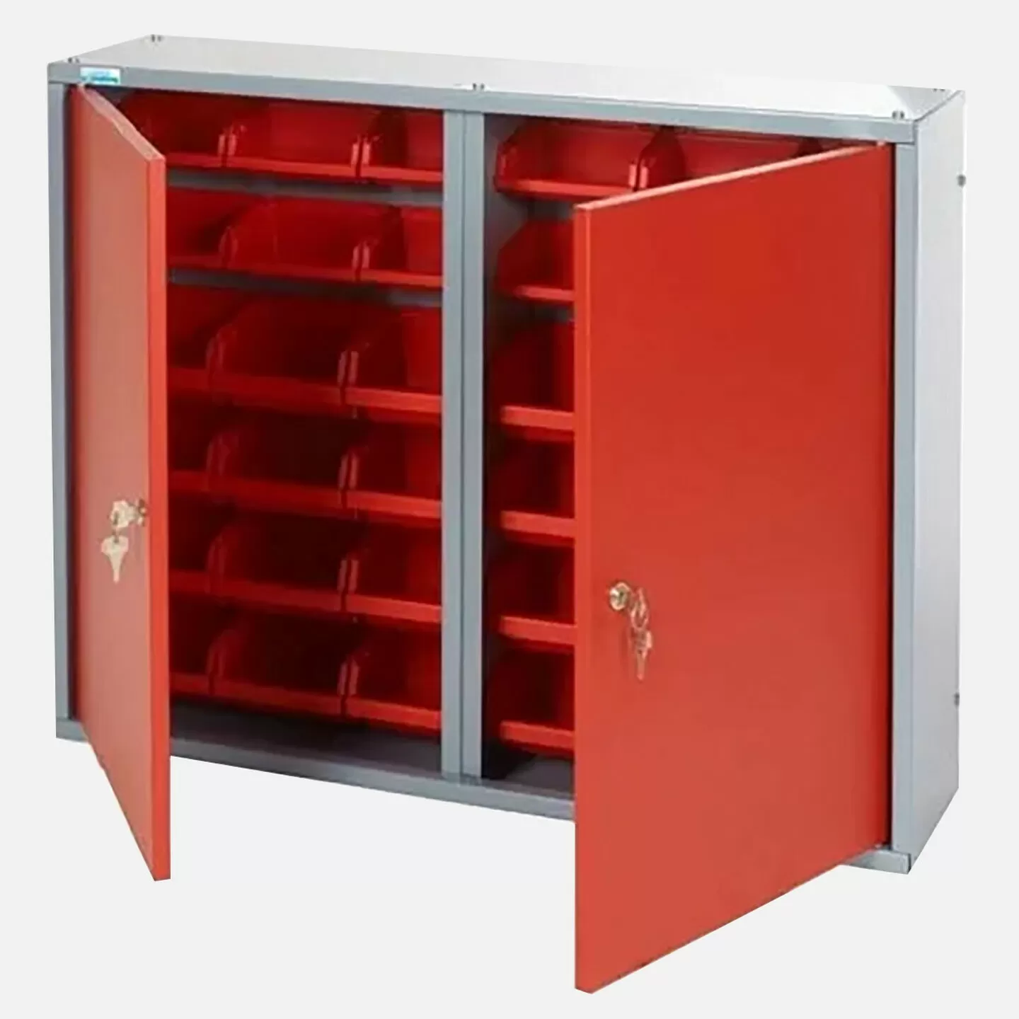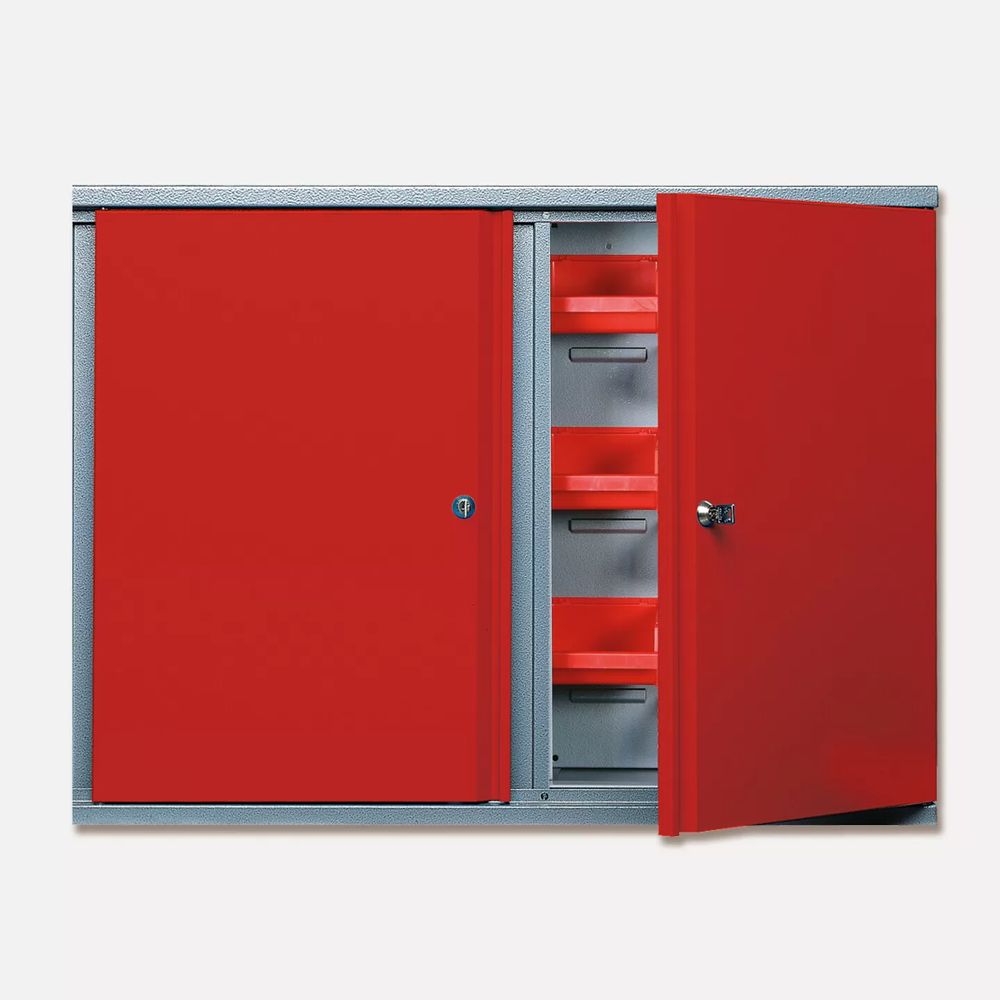 Çelik sacdan yapılmış iki kapaklı duvar dolabı hem evde hem de atölyede ideal saklama olanağı sağlar.