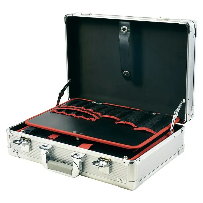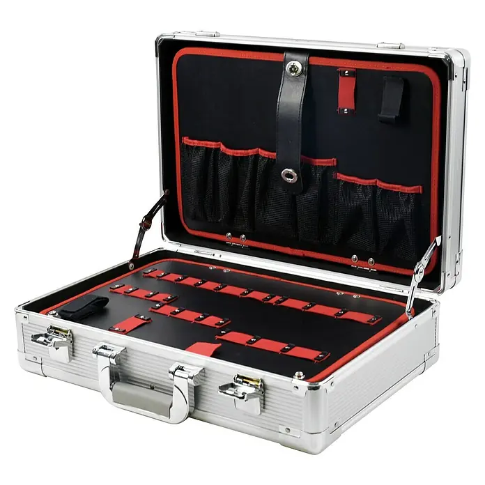 WISENT alüminyum makine çantası, profesyonel kullanıcılar ve düzenli çalışmayı sevenler için özel olarak tasarlanmıştır. Sağlam alüminyum gövdesi sayesinde aletlerinizi darbelere, düşmelere ve dış etkenlere karşı güvenle korur. Güçlendirilmiş köşe yapısı, uzun ömürlü kullanım sunarken zorlu çalışma koşullarında bile maksimum dayanıklılık sağlar.